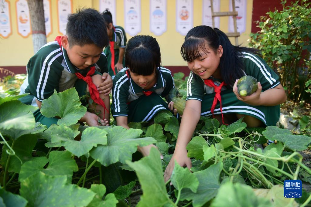 9月21日,沧州市新华区荣官屯小学的小学生在校园里采摘。