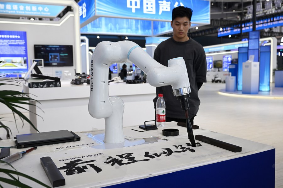 9月20日,工作人员在2023世界制造业大会上展示一款会写书法的智能机器人。新华社记者 周牧 摄