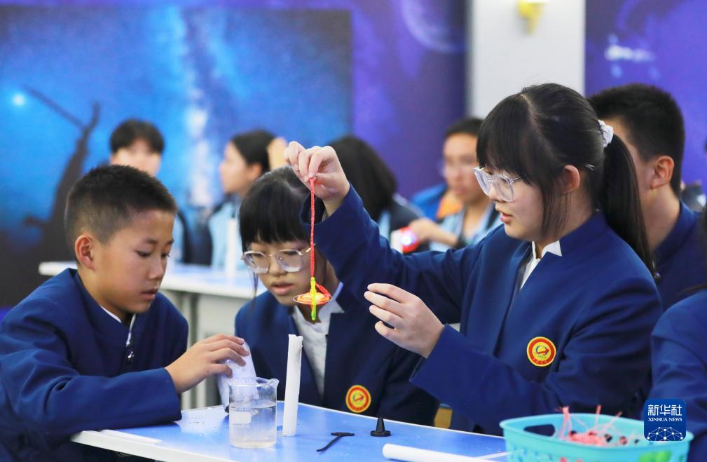 9月21日,在内蒙古阿拉善盟额济纳旗,学生在做趣味实验。新华社发(敖琪 摄)