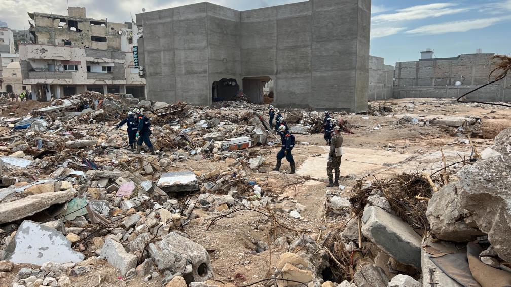 9月17日,国际救援人员在利比亚德尔纳的建筑废墟上工作。新华社发(哈姆扎·图尔基亚摄)