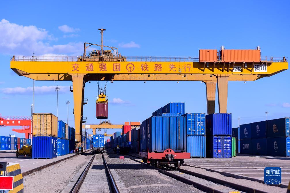 这是9月20日拍摄的满洲里站货运车间集装箱场内换装作业现场。