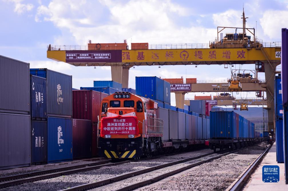 这是9月20日拍摄的满洲里站货运车间集装箱场内、换装完毕的一列中欧班列。