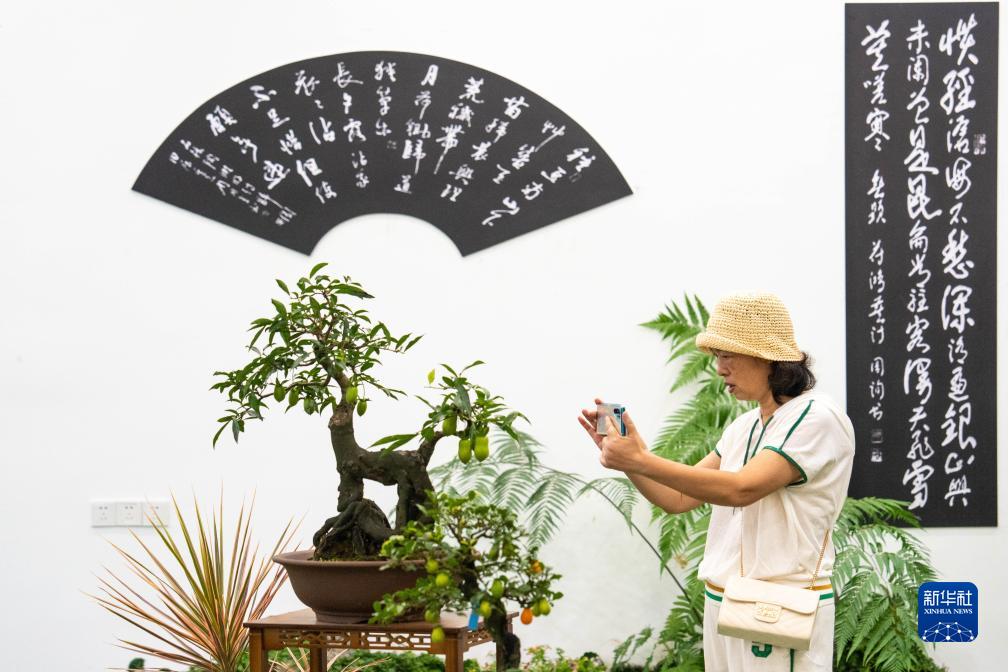 9月22日,在湘潭盘龙大观园,观众在给展出的盆景拍照。