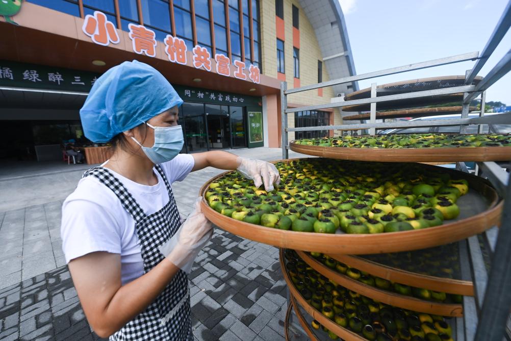在浙江省建德市三都镇松口村的小青柑共富工坊,工人把青柑茶搬运至晒场进行晾晒。新华社记者徐昱 摄