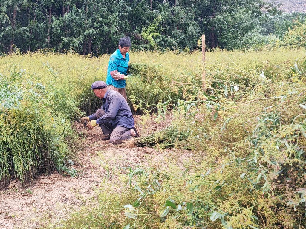 在甘肃省临夏回族自治州康乐县莲麓镇下乍村,戚建杰(前)和爱人正在收获柴胡。新华社记者 王朋 摄