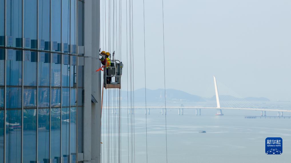 在中国电子集团深圳湾总部基地建设现场,工人在吊篮上进行外立面装饰条安装作业(无人机照片,9月22日摄)。