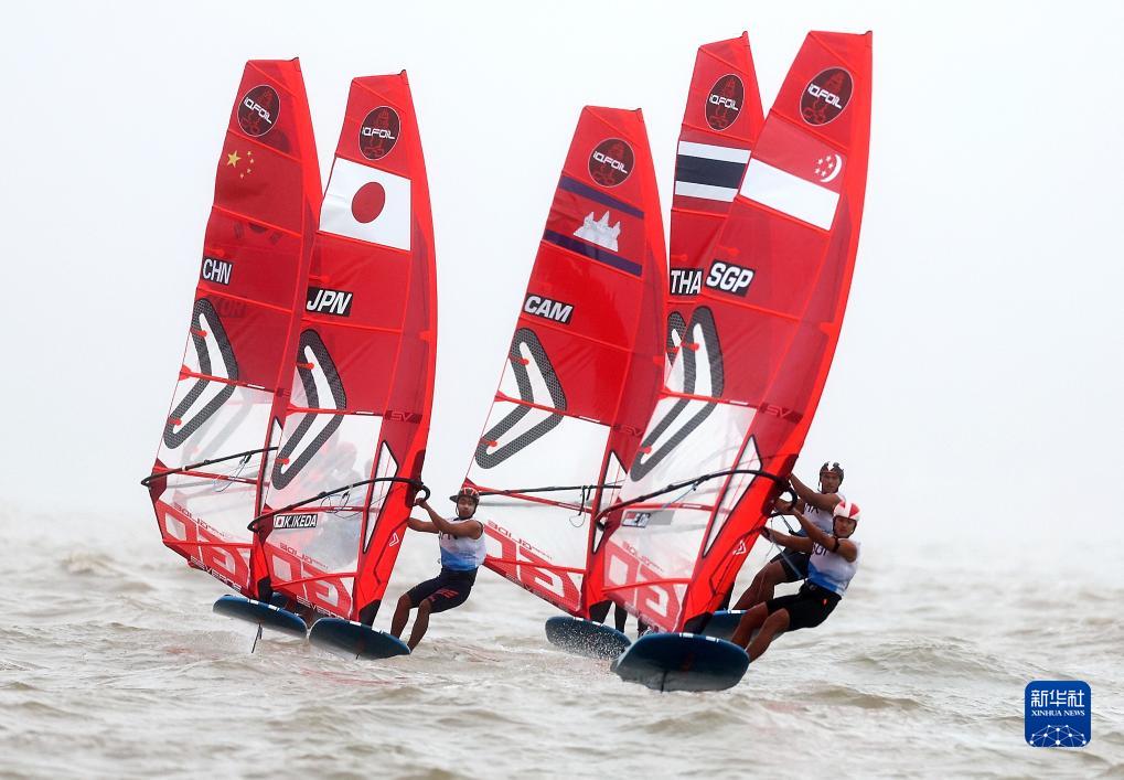 当日,杭州亚运会帆船项目男子水翼帆板-iQFoil级比赛在浙江省宁波市象山亚帆中心展开第二日的角逐。新华社记者 陈斌 摄