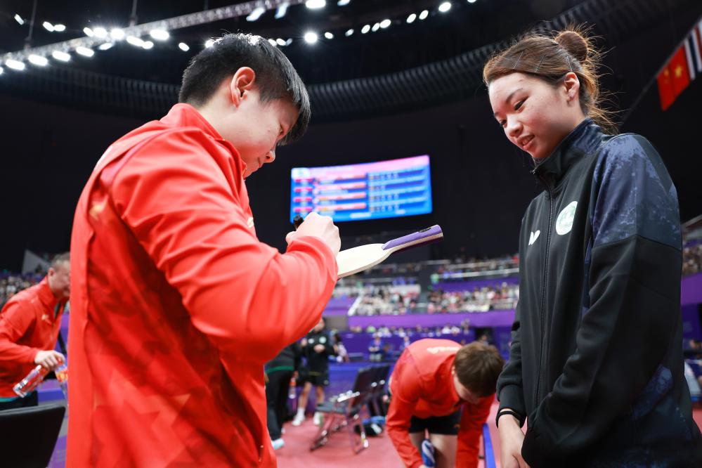 9月22日,中国队选手孙颖莎(左)赛后为中国澳门队选手石慧莉签名。新华社记者 刘续 摄