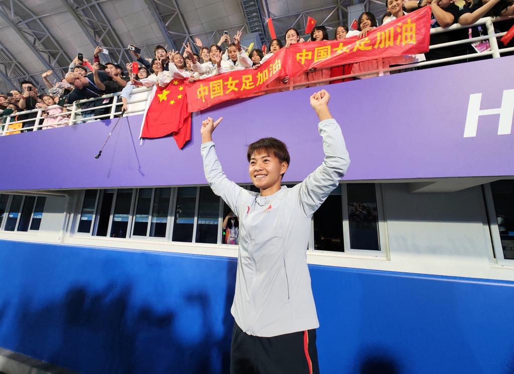 新华社杭州9月22日电(记者岳冉冉、王浩明、陈地)22日晚,中国女足16:0战胜蒙古国女足,迎来杭州亚运会首胜。独进五球的王霜赛后急切地来到东侧看台,寻找她的“偶像”。