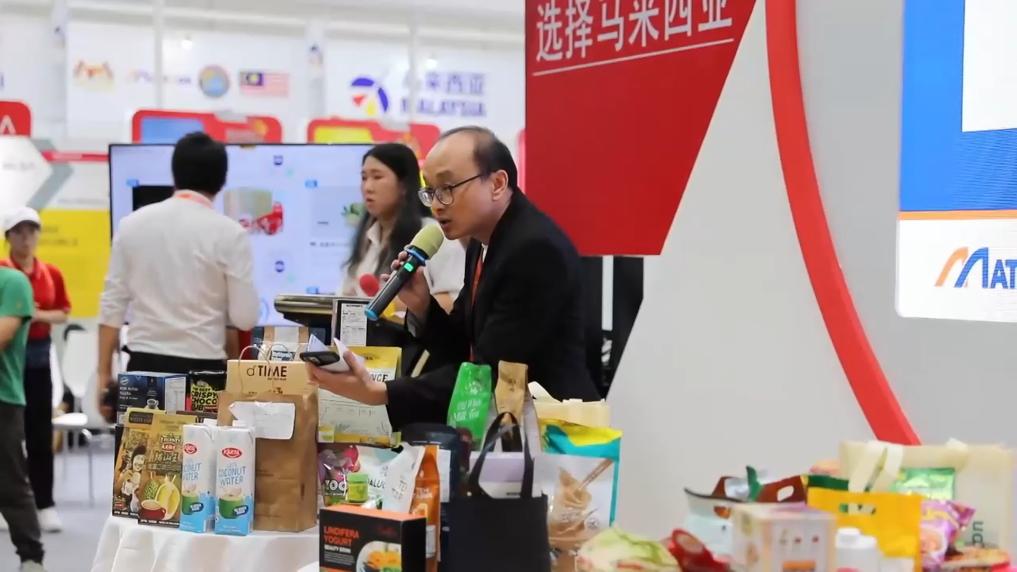 走进马来西亚馆,一场产品推介会正在进行中。马来西亚参展商姚建祥正在台上热情推介一款椰子水。