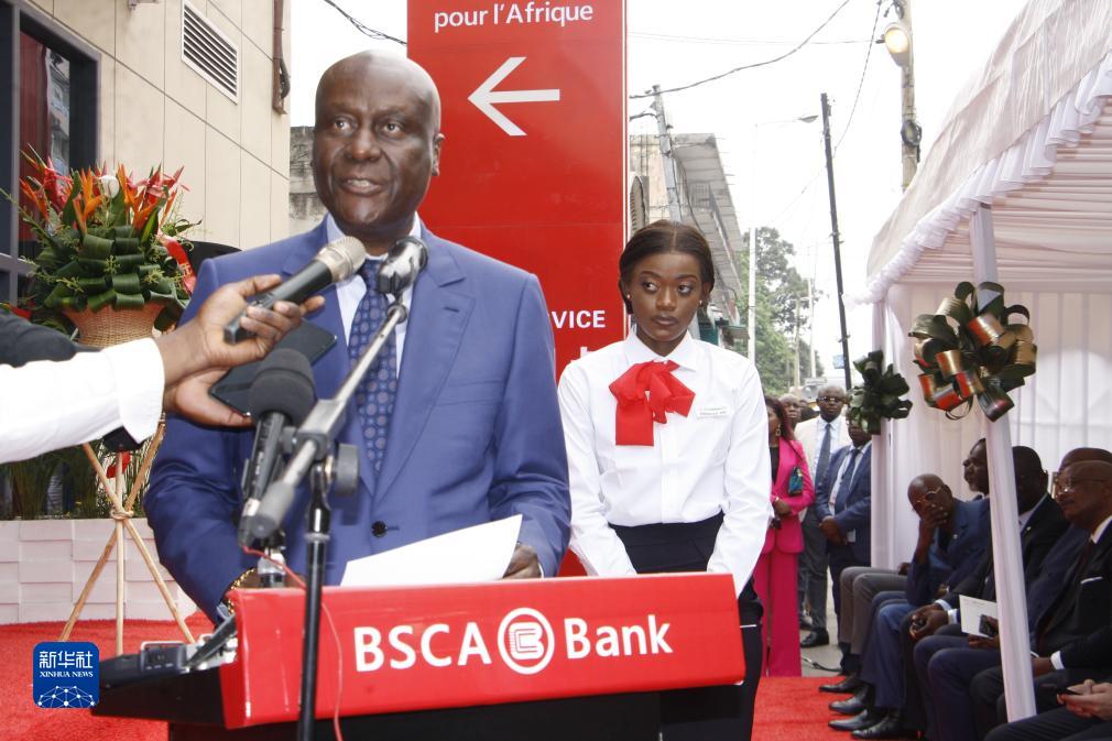 9月22日,在刚果(布)首都布拉柴维尔,刚果(布)经济和财政部长翁达耶(左一)在中刚非洲银行新营业厅剪彩仪式上致辞。新华社发(基蒂纳摄)