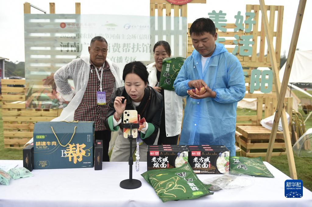 9月23日,工作人员在活动现场通过网络直播推介特色农产品。