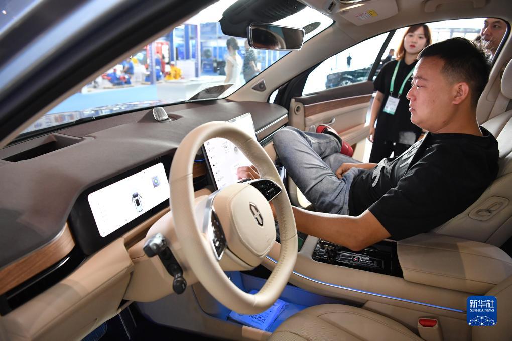 9月22日,观众在展会上体验一款新能源汽车。