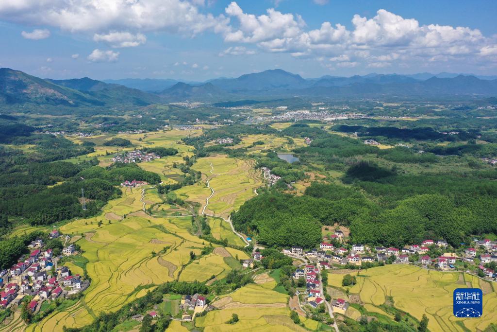 金秋时节,皖南山区安徽省宣城市旌德县白地镇梯田喜获丰收。金黄的梯田与连绵的群山、错落的民居相互映衬,勾勒出一幅优美的丰收画卷。