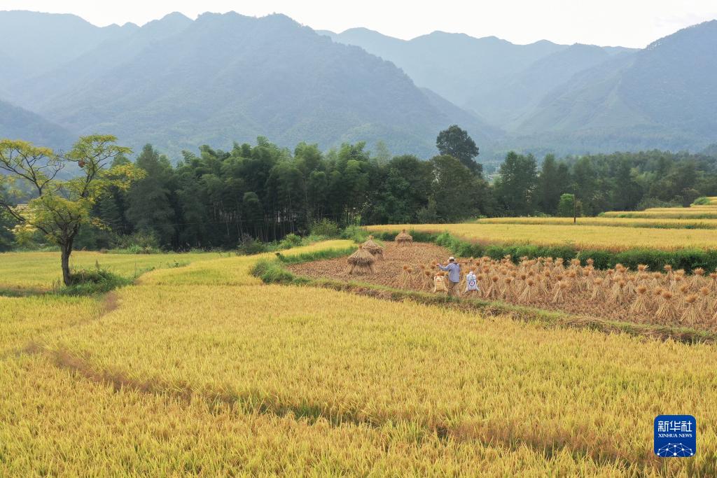 金秋时节,皖南山区安徽省宣城市旌德县白地镇梯田喜获丰收。金黄的梯田与连绵的群山、错落的民居相互映衬,勾勒出一幅优美的丰收画卷。