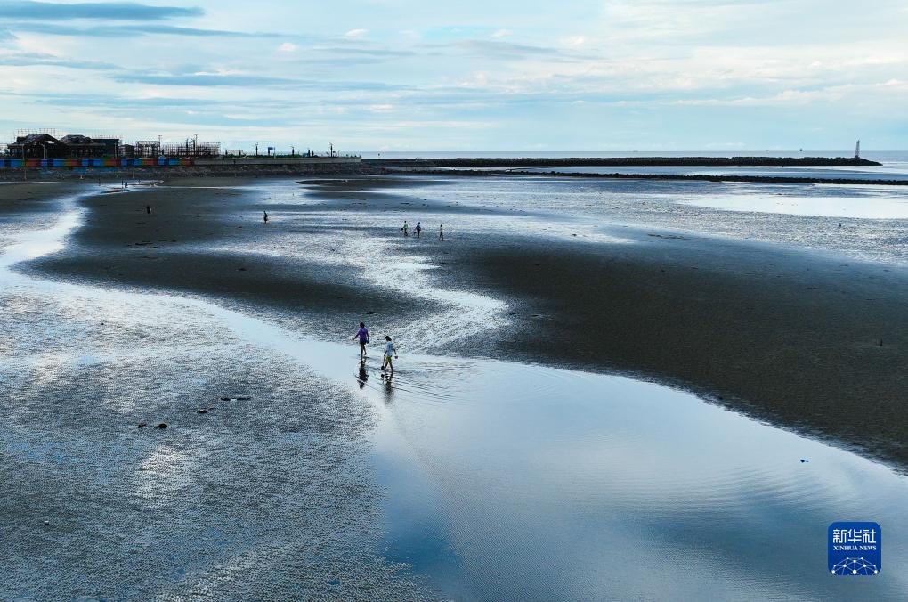 9月16日,游客在江苏省启东市“十里海湾”滩涂上游玩(无人机照片)。