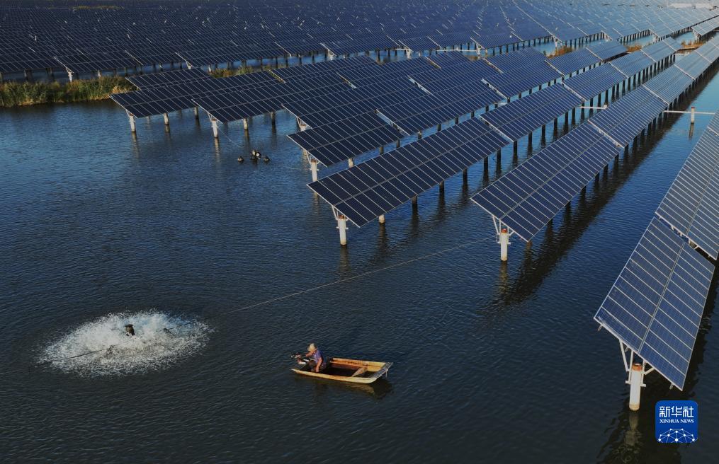 9月16日,在河北省唐山市丰南区黑沿子镇“渔光一体”现代渔业产业园,渔民在鱼塘里工作(无人机照片)。
