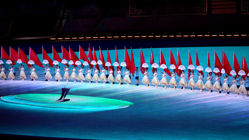 团扇,寓意团结与友善。运动员入场时,地屏之上勾勒出团扇造型,各式各样的江南元素与景象浮现其中;网幕上,“梅兰竹菊”主题之窗尽展典雅、吉祥之意;窗中书法字体隽永飘逸,以中华笔触抒写亚洲风采,以独特的江南韵味迎接运动员入场。