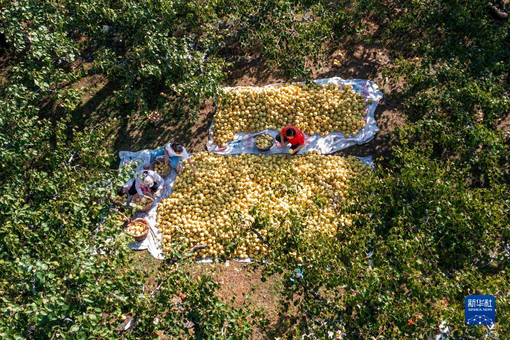 9月20日,安徽省宿州市砀山县园艺场工人在分拣刚采摘的砀山酥梨(无人机照片)。