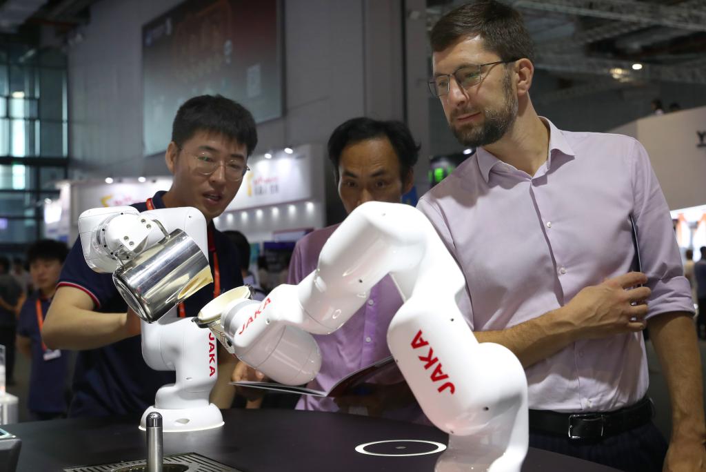 第二十三届中国国际工业博览会在上海开幕。9月19日,参观者在观看机器人制作咖啡。新华社记者 方喆 摄