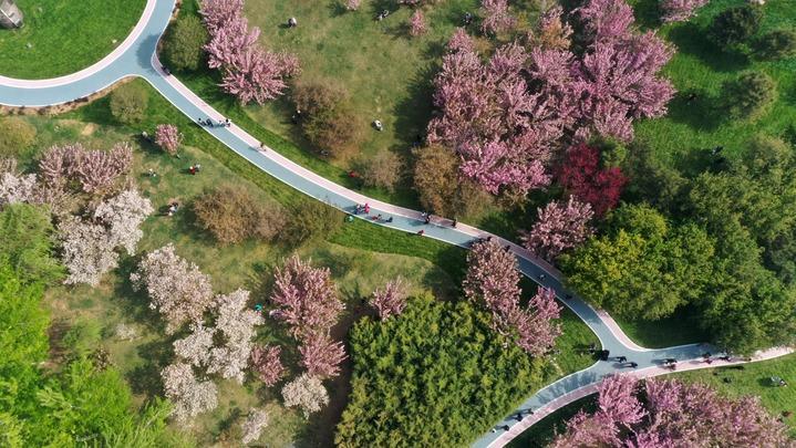 4月9日,游客在河北省石家庄市栾城区樱花公园休闲游玩(无人机照片)。新华社记者 骆学峰 摄