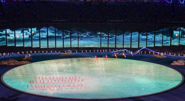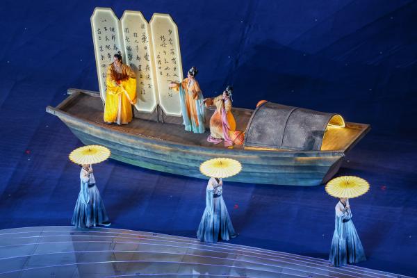 在“灯火耀古今”章节,十艘展现宋代风采的木船缓缓驶入,船上有身着宋式风格袍服的商人。每艘船上演员的服装色彩都是一组中国传统色系,包括宋瓷青瓷色系、紫烟色系、粉红色系、黄色系、白色系配红、青碧色系、墨染色系、红色系、春新(绿)色系、深紫色系十组,分别代表瓷、香、绸、扇、印、酒、画、伞、茶、商,展示了民间生活与贸易往来的场景,体现宋代杭州的繁荣经济与雅致生活。最后,百位身着宋韵古装的少男少女涌上舞台,提着灯笼高声祝福“相知无远近,万里尚为邻”欢迎远道而来的各国嘉宾和运动员。