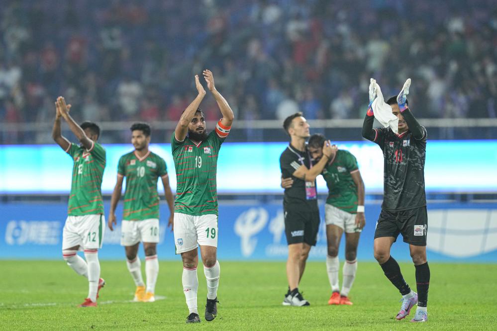 9月24日,孟加拉国队球员在比赛结束后向观众致意。新华社记者 吴壮 摄
