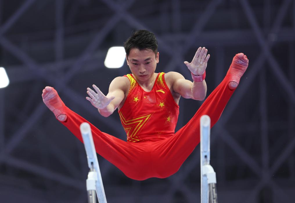 9月24日,中国选手邹敬园在双杠比赛中。新华社记者 程婷婷 摄