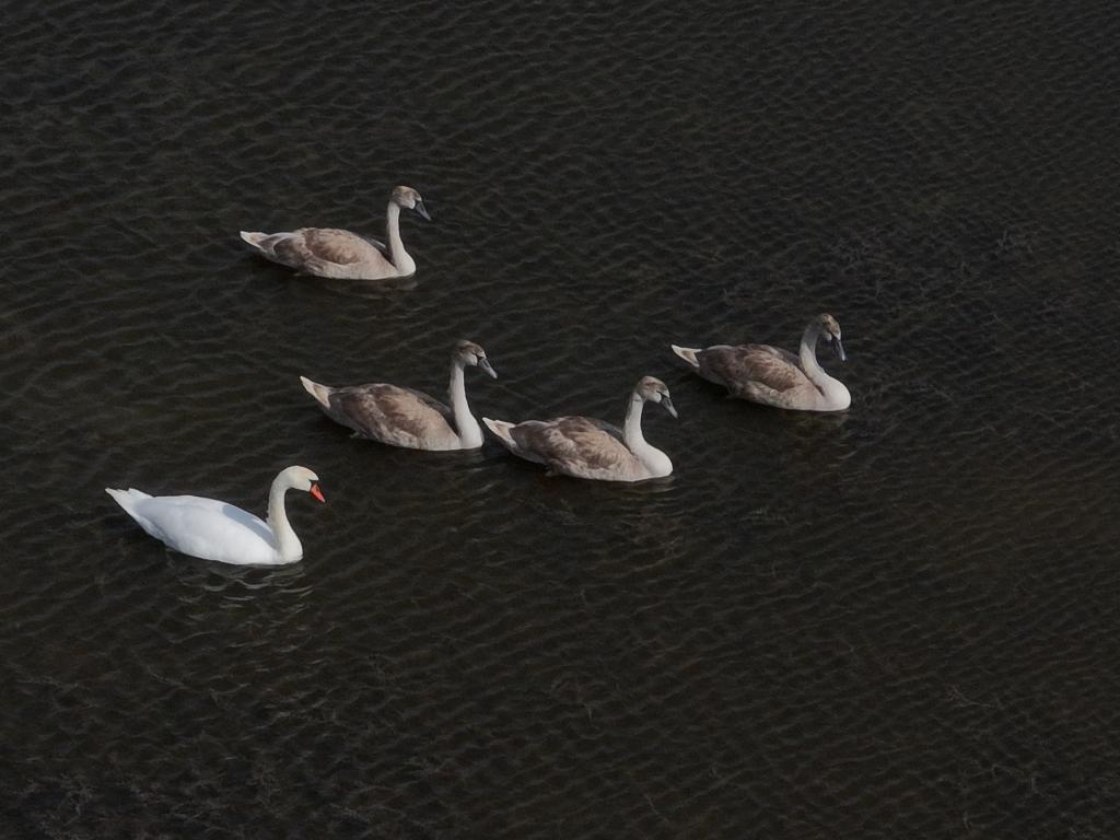9月24日,成年疣鼻天鹅带着幼鸟在乌梁素海湖面上嬉戏。