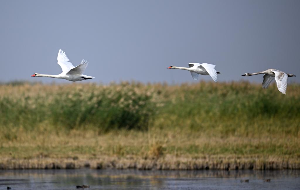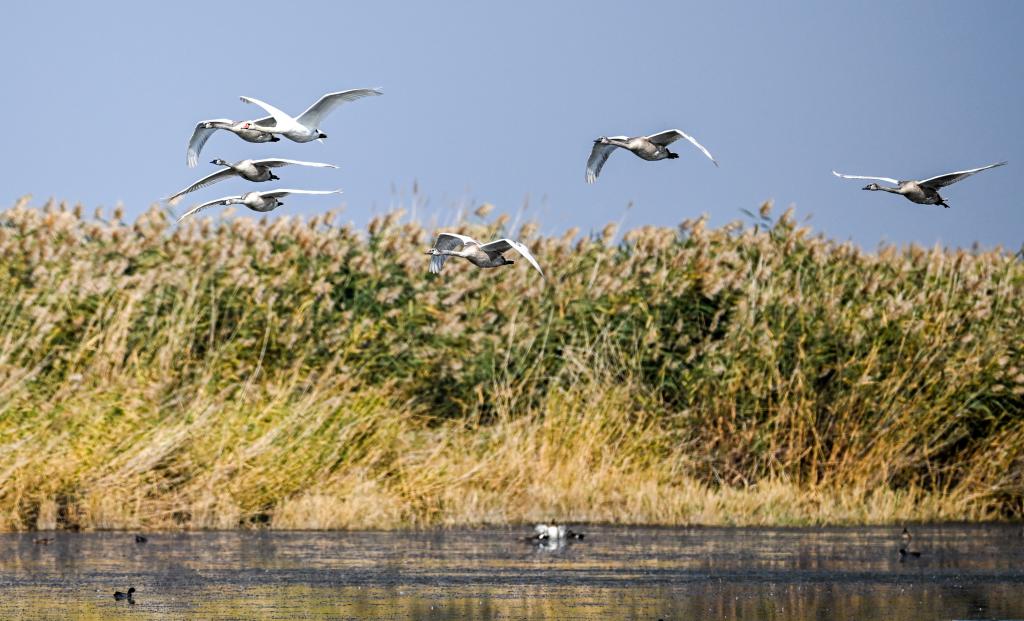 近日,在乌梁素海湖面上,成年疣鼻天鹅带领幼鸟练习飞翔,为过冬前的长途迁徙做准备。