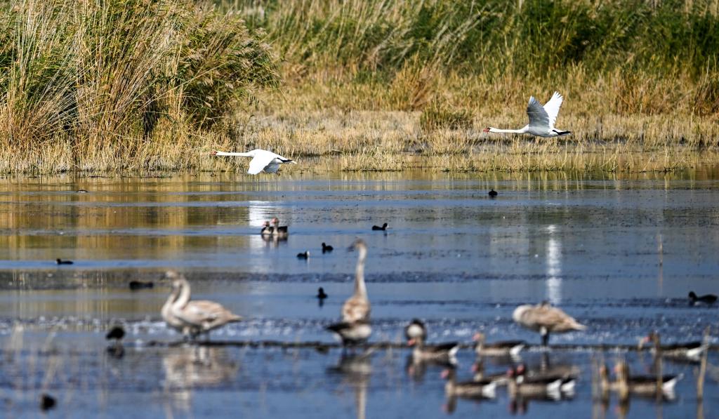 本来前往西伯利亚的疣鼻天鹅也在乌梁素海产卵、孵化、生活,乌梁素海成为我国最大的疣鼻天鹅繁殖基地。