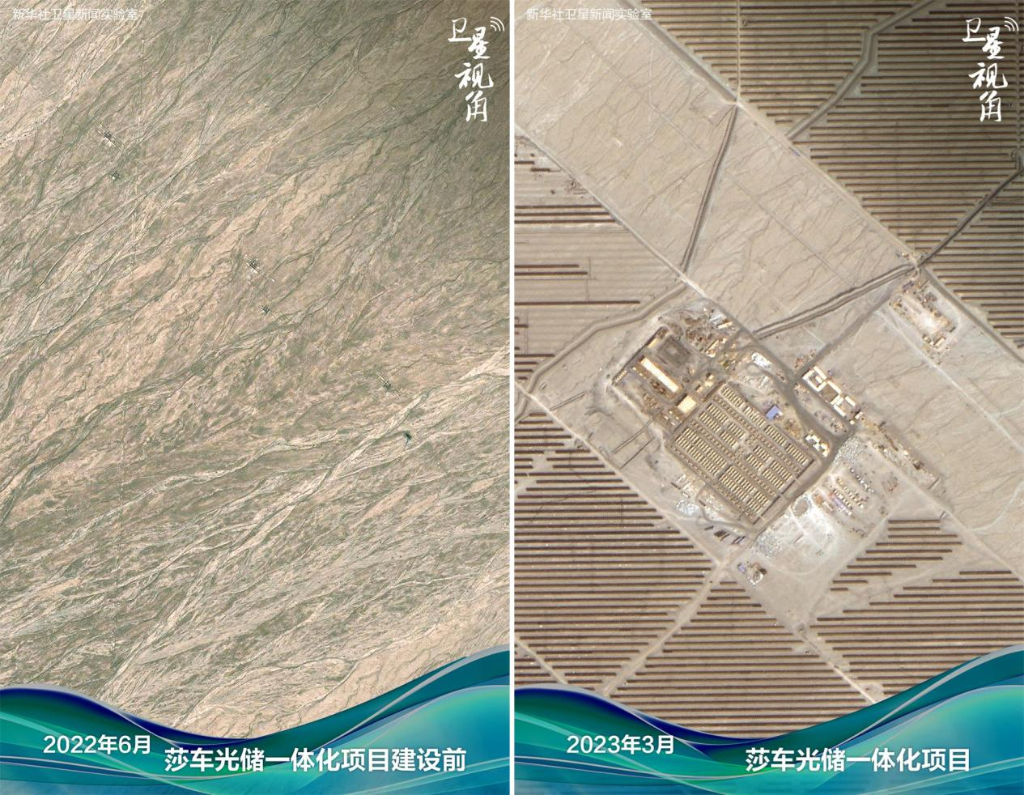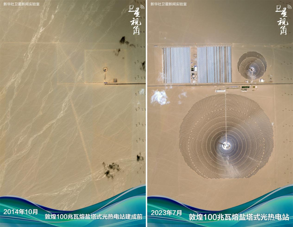 ↑2023年与2014年对比,敦煌戈壁滩上建起“超级镜子发电站”。