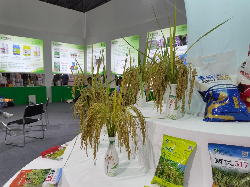 “全国种子双交会”现场,合肥丰乐种业股份有限公司展台上展示的水稻品种。新华社记者 水金辰 摄