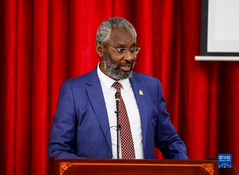 9月26日,在肯尼亚内罗毕大学孔子学院,内罗毕大学副校长斯蒂芬·基亚马·吉塔希在中文教材《东非实用中文课本》出版签约仪式上发言。新华社记者 李亚辉 摄