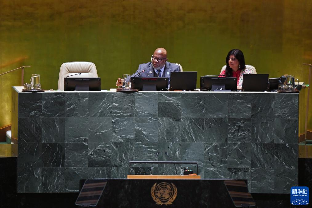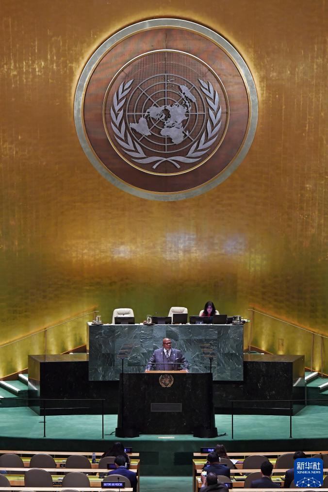 9月26日,在位于纽约的联合国总部,第78届联大主席弗朗西斯(中)发表联合国大会一般性辩论闭幕讲话。 新华社记者李睿摄