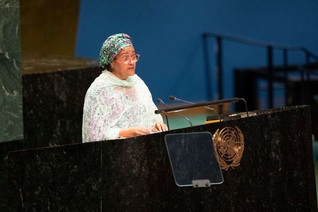 9月5日,在位于纽约的联合国总部,联合国常务副秘书长阿明娜·穆罕默德代表联合国秘书长古特雷斯在第78届联合国大会第一次全会上致辞。新华社记者谢锷摄