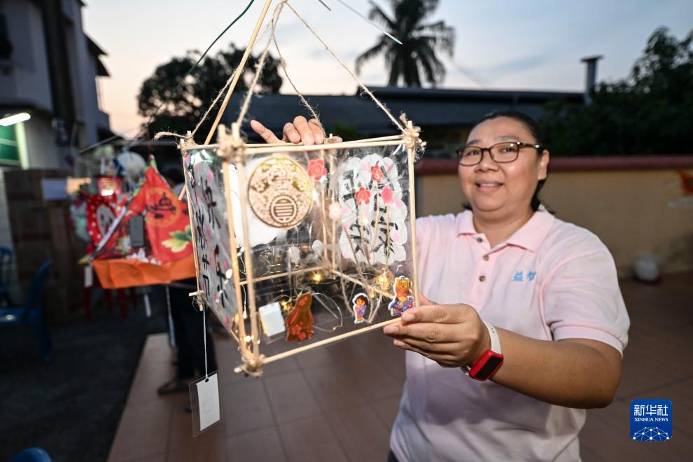 9月27日,一名女子在马来西亚马六甲州丹绒吉宁的中秋晚会上展示灯笼。