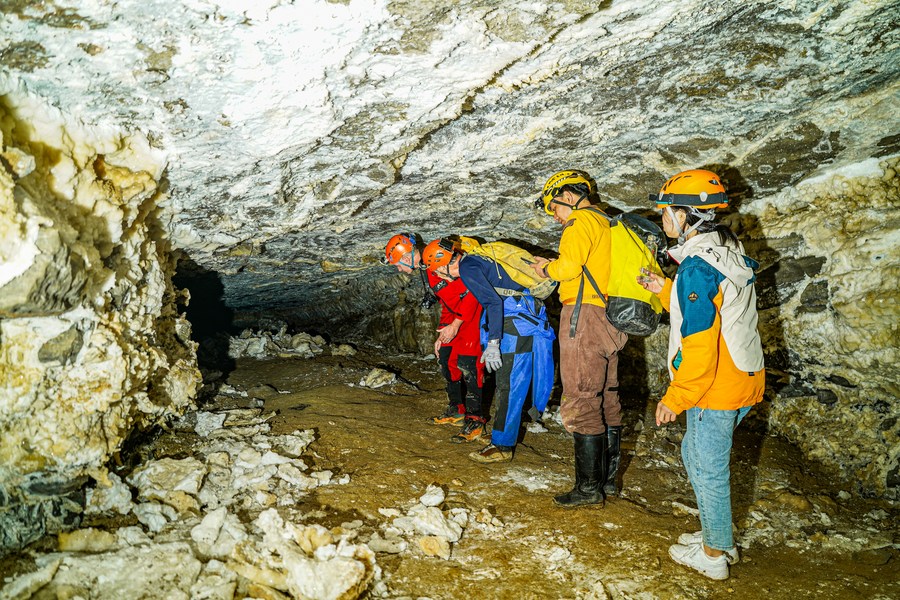 9月22日,意大利专家和贵州省山地资源研究所科考队员在双河洞一处支洞中进行科考。新华社发(赵飞 摄)