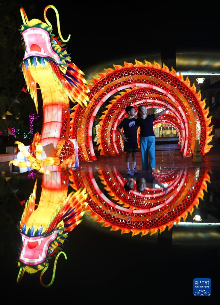 9月27日,游客在南岳祝融彩灯艺术展上打卡游玩。