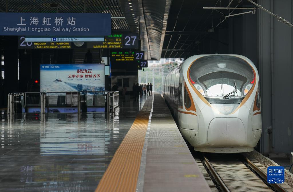 9月28日,载有铁路建设者和各界代表的首发列车驶入上海虹桥站。新华社记者 丁汀 摄
