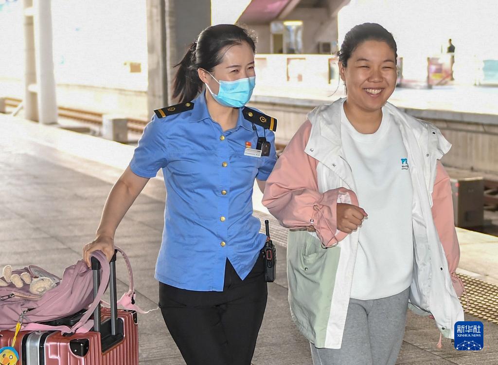 9月28日,长春站“春之约”爱心服务室客运值班员马丛(左)引导视障旅客上车。
