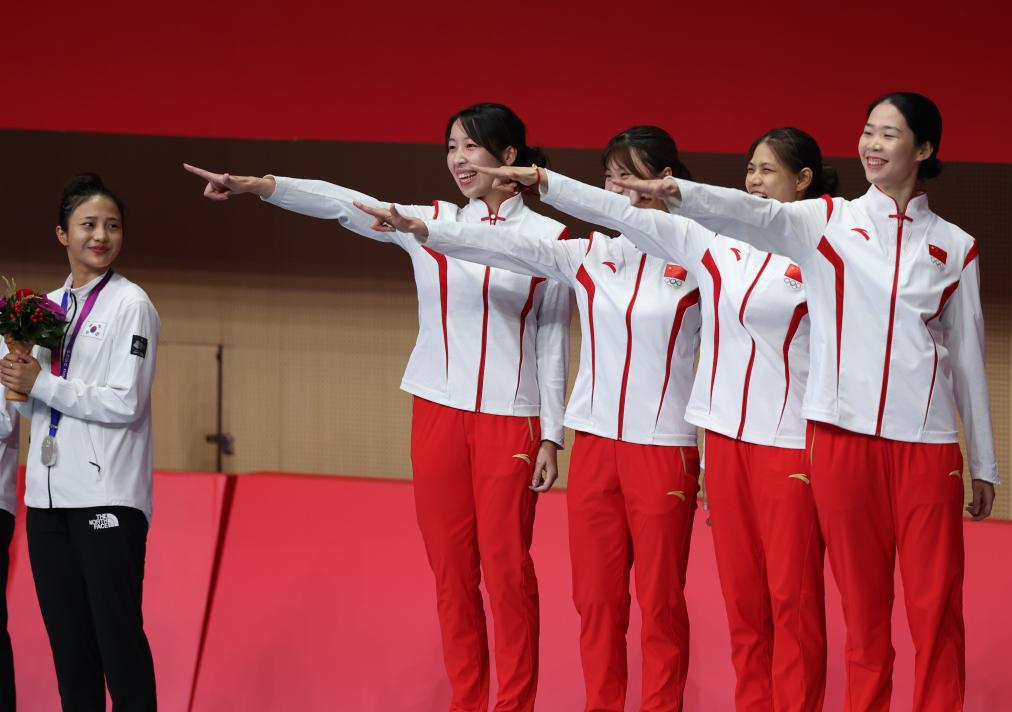 9月28日,冠军中国队在领奖台上。当日,在杭州亚运会击剑项目女子团体花剑比赛中,中国队获得冠军。新华社记者 杨磊 摄