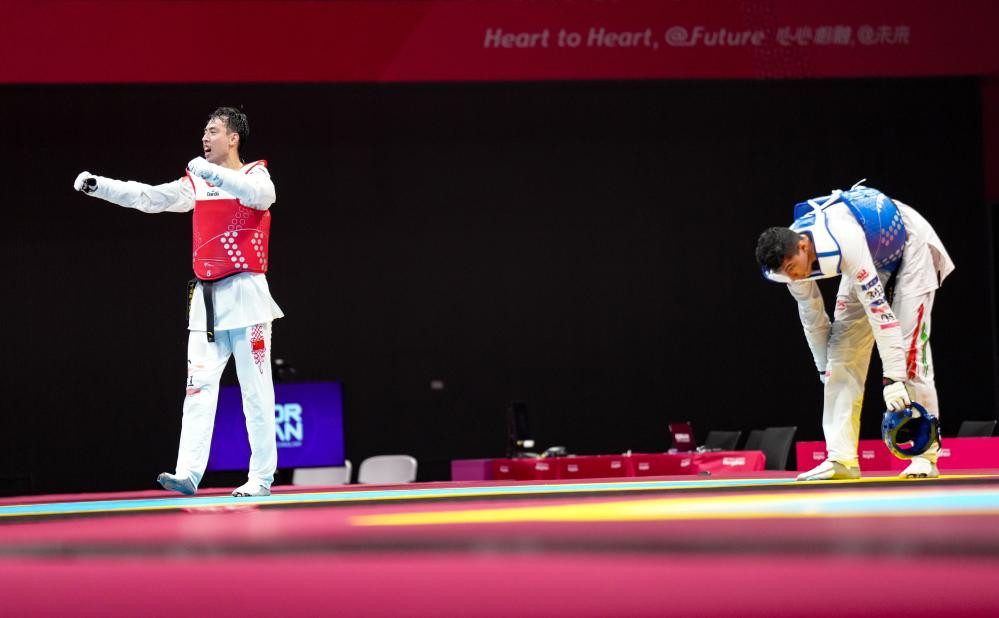 9月28日,杭州亚运会跆拳道男子80公斤以上级比赛在浙江杭州临安体育文化会展中心体育馆举行,中国选手宋兆祥获得金牌。新华社记者 江文耀 摄