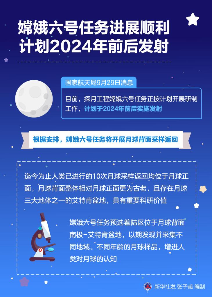 新华社北京9月29日电(记者胡喆)国家航天局29日消息,目前,探月工程嫦娥六号任务正按计划开展研制工作,计划于2024年前后实施发射。