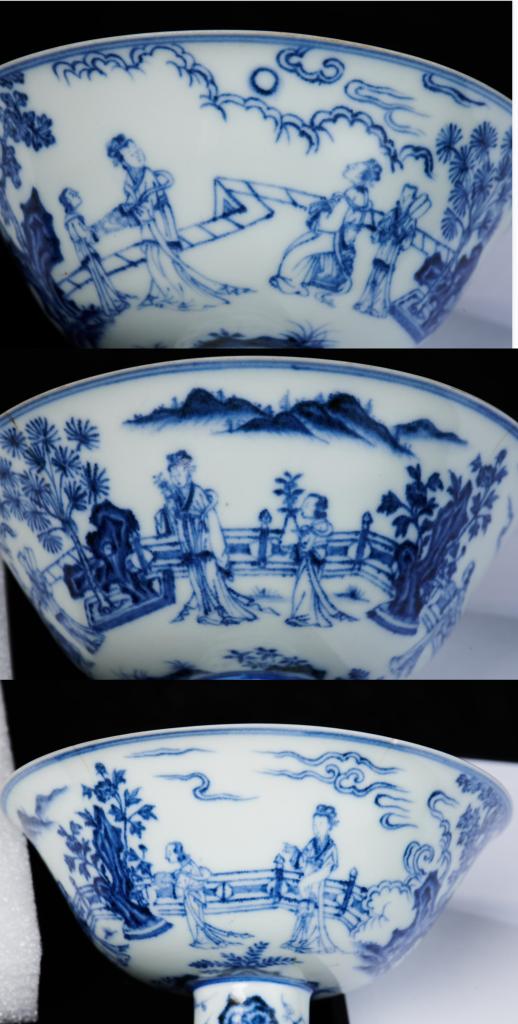 明青花瑶台赏月图瓷锺高10.1厘米,口径15.5厘米。外壁描绘了3组人物图像:第1组图画中,一位老妇侧坐于石墩,于松下遥赏明月,身后的侍女双手持扇,老妇对面站着一位年轻女子,掬起侍童所执盘中的一捧清水。第2、3组画面表现的是女子于山石间赏月观花的情景。