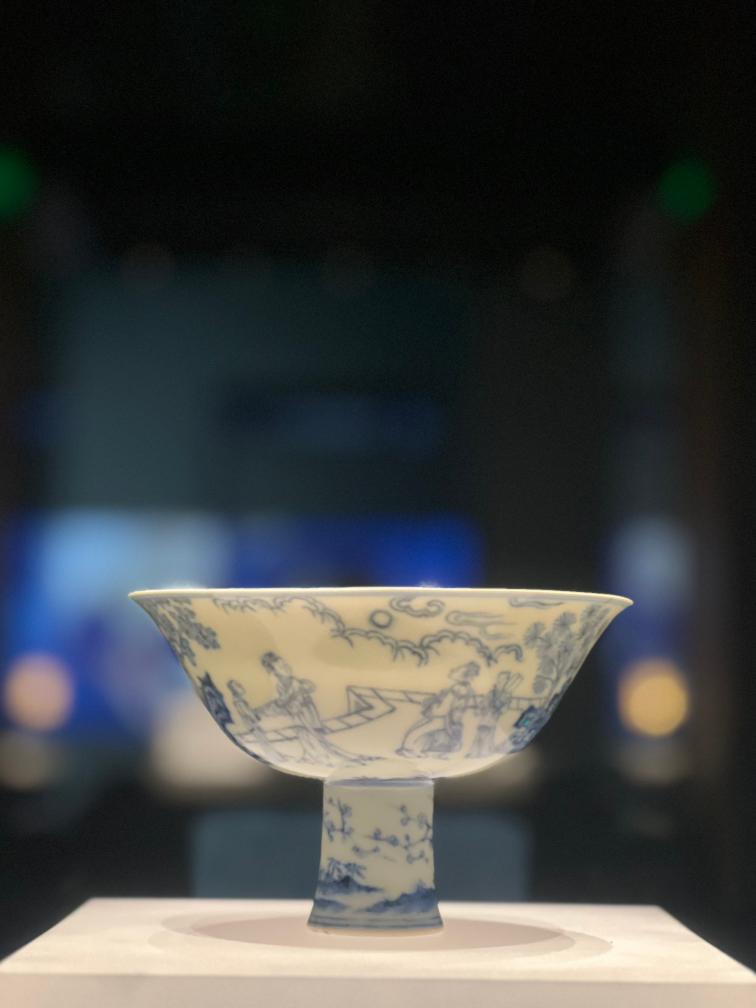 这件瓷锺于2001年出土于湖北省钟祥市梁庄王墓,现陈列于湖北省博物馆“梁庄王珍藏——郑和时代的瑰宝”展厅。穿过华丽精美的珠翠、玉饰,明青花瑶台赏月图瓷锺被陈列于中心位置,细看白釉光洁肥润,青花温婉如丝。