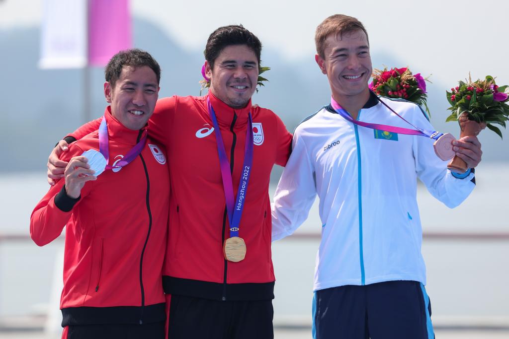 9月29日,冠军日本选手新名健二(中)、亚军日本选手小田仓真(左)和季军哈萨克斯坦选手阿扬·别伊先巴耶夫在颁奖仪式上合影。新华社记者 吴壮 摄