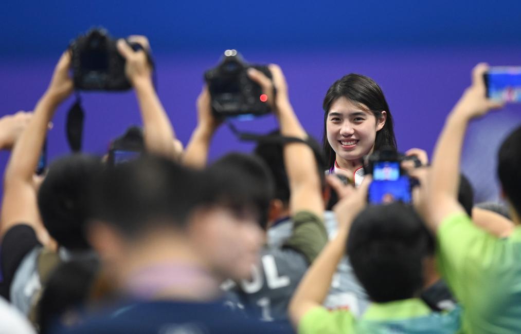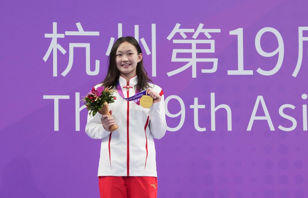 9月29日,中国选手张雨霏在赛后留影。当日,杭州亚运会游泳项目比赛全部进行完毕。新华社记者 黄宗治 摄