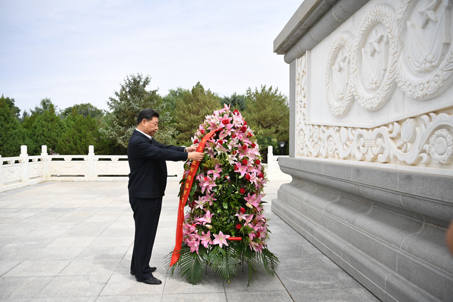 2019年8月20日上午,习近平总书记来到甘肃省张掖市高台县,瞻仰中国工农红军西路军纪念碑和阵亡烈士公墓,向西路军革命先烈敬献花篮,并参观了中国工农红军西路军纪念馆。新华社记者 谢环驰 摄