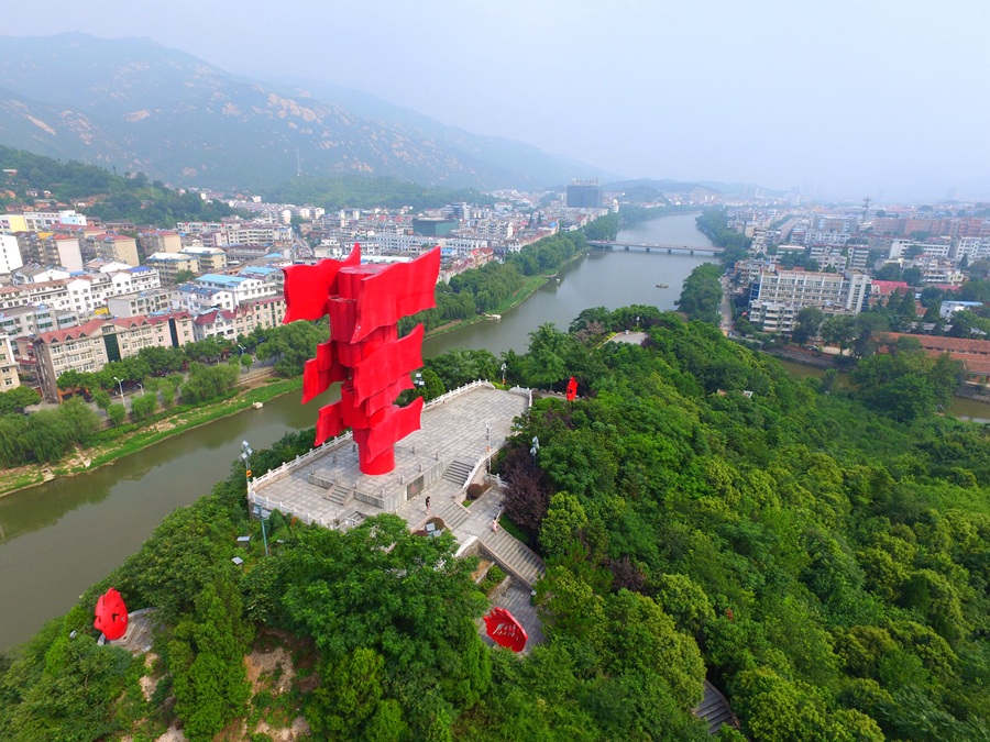 这是河南省信阳市新县鄂豫皖苏区首府革命博物馆附近的英雄山八面红旗雕塑(2017年8月4日无人机照片)。新华社记者 冯大鹏 摄